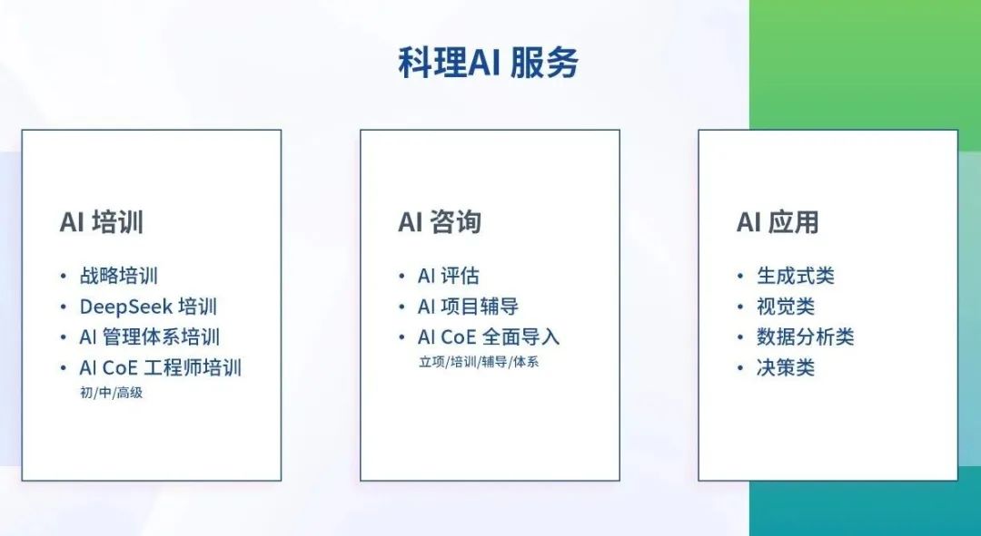AI 培訓(xùn),實(shí)戰(zhàn)培訓(xùn)課程包括:戰(zhàn)略培訓(xùn)、DeepSeek 培訓(xùn)、AI 管理體系培訓(xùn)、AI CoE 工程師培訓(xùn)(初級(jí)、中級(jí)、高級(jí));